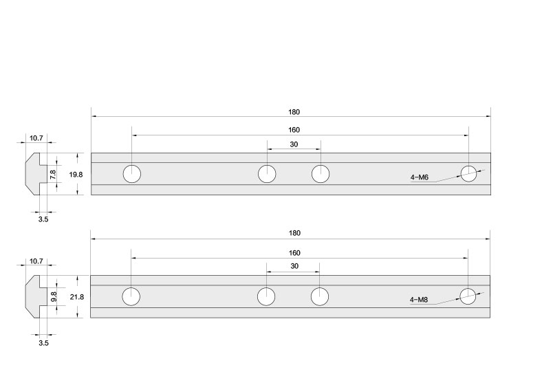 用于兩根型材之間直線加長連接,安裝時(shí)將其插入兩根型材對接觸槽坑內(nèi),然后用緊固螺絲鎖緊。