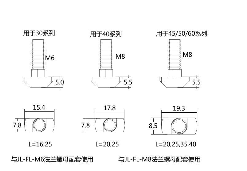 T型螺栓直接放入型材槽內(nèi),安裝過程中它能自動定位鎖緊,常與法蘭螺母配合使用,是安裝角件等型材配件的好幫手。根據(jù)不同型材,槽寬及按準(zhǔn)過要求可選用不同規(guī)格及長度的T型螺栓。